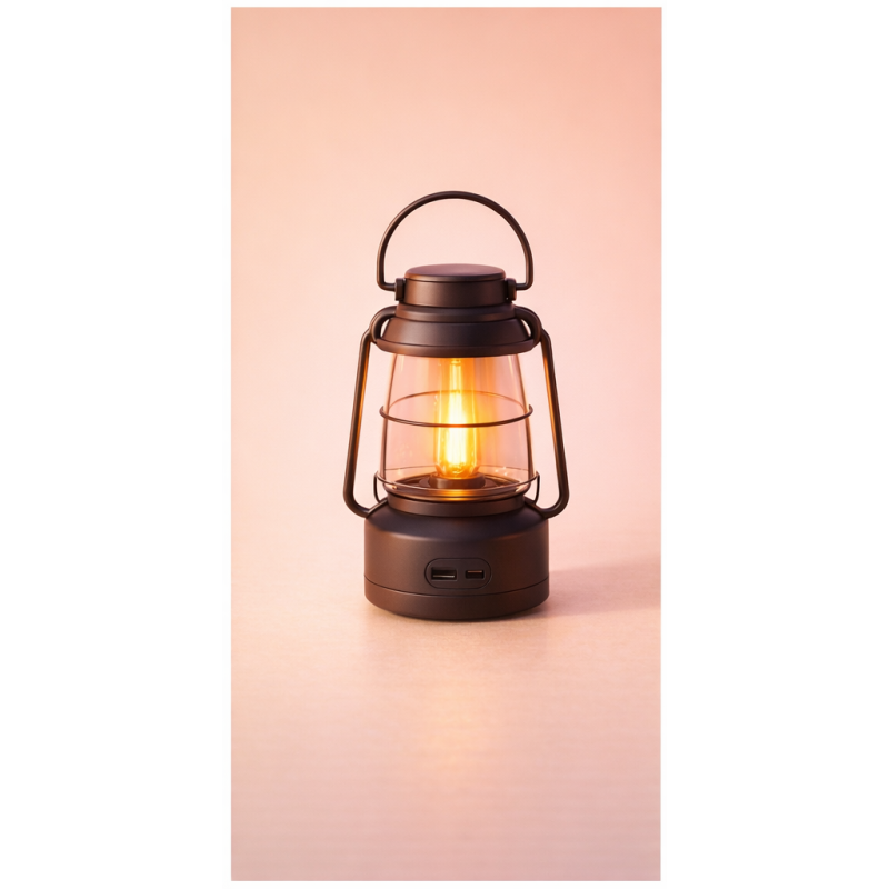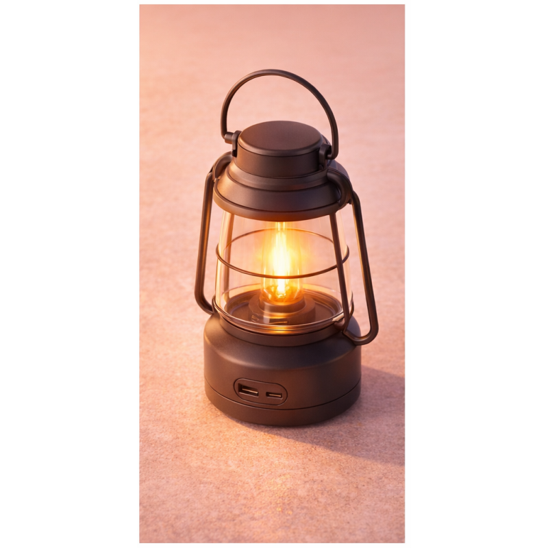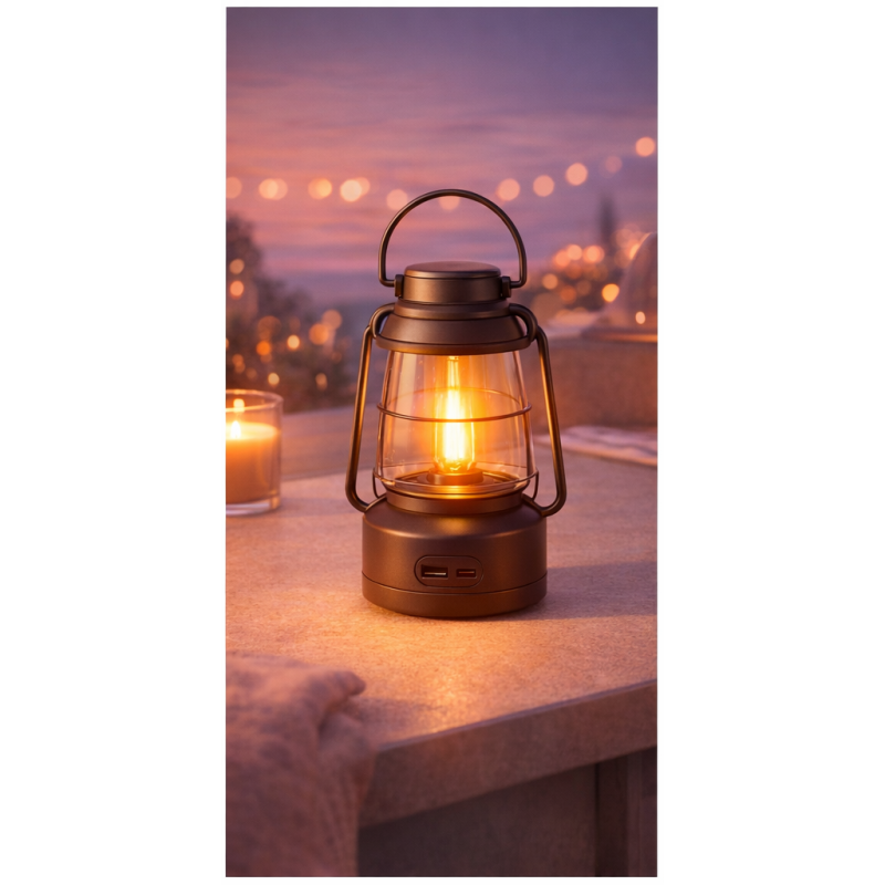 Šis įkraunamas žibintas duoda šiltą šviesą vakarui lauke ir kartu išlieka praktiškas, kai reikia pasiimti jį į išvyką ar naudoti namuose.